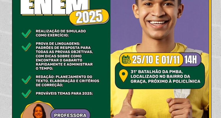 A Prefeitura de Valença, por meio da Secretaria de Juventude e Esportes, promoverá um aulão preparatório para o ENEM 2025, voltado aos estudantes que irão participar do exame nacional. O evento ocorrerá nos dias 25 de outubro e 1º de novembro, a partir das 14h, no 31º Batalhão da Polícia Militar da Bahia (PMBA), localizado no bairro da Graça, próximo à Policlínica.