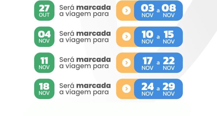PREFEITURA DE VALENÇA DIVULGA CRONOGRAMA DE AGENDAMENTO DO TFD PARA O MÊS DE NOVEMBRO Ricardo Lemos 23 de outubro de 2025 Notícias, Política A Prefeitura de Valença, por meio da Secretaria Municipal de Saúde, divulgou as datas de agendamento para o Tratamento Fora do Domicílio (TFD) referentes ao mês de novembro. O serviço garante o transporte de pacientes que precisam realizar consultas, exames e procedimentos médicos em outros municípios. Confira o cronograma: 27 de outubro – marcação da viagem para o período de 03 a 08 de novembro 04 de novembro – marcação da viagem para o período de 10 a 15 de novembro 11 de novembro – marcação da viagem para o período de 17 a 22 de novembro 18 de novembro – marcação da viagem para o período de 24 a 29 de novembro Atenção, pacientes oncológicos: o agendamento deve ser realizado um dia antes da data de marcação oficial. Os agendamentos podem ser feitos de forma prática pelo WhatsApp, no número (75) 98166-4310. A Secretaria de Saúde reforça o compromisso da gestão em garantir acesso ao cuidado e acolhimento necessários aos pacientes que dependem do TFD. Cuidar da nossa gente é prioridade! SECOM | Prefeitura Municipal de Valença Deixe uma resposta Cancelar resposta Seu endereço de email não será publicado.ComentarNome* Email* Website