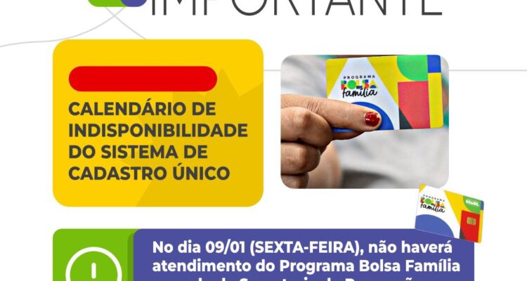 SISTEMA DO CADASTRO ÚNICO FICARÁ INDISPONÍVEL NESTA SEXTA-FEIRA (09) Ricardo Lemos 7 de janeiro de 2026 Notícias, Política COMUNICADO OFICIAL A Prefeitura Municipal de Valença, por meio da Secretaria de Promoção Social e da Secretaria de Comunicação (SECOM), informa que nesta sexta-feira, dia 09 de janeiro, o sistema do Cadastro Único (CadÚnico) estará temporariamente indisponível em todo o país. A interrupção ocorre em razão de uma manutenção nacional realizada pelo Governo Federal, destinada à atualização mensal do Portal do Cadastro Único. Em decorrência disso, não haverá atendimento relacionado ao CadÚnico e ao Programa Bolsa Família na sede da Secretaria de Promoção Social durante a data informada. A medida é necessária para garantir a segurança, a atualização e o pleno funcionamento do sistema, que é essencial para a gestão dos programas sociais. A Prefeitura de Valença agradece a compreensão da população e orienta que os atendimentos sejam reagendados para o próximo dia útil após a normalização do sistema. Secretaria de Comunicação – SECOM Prefeitura Municipal de Valença Deixe uma resposta Cancelar resposta Seu endereço de email não será publicado.ComentarNome* Email* Website
