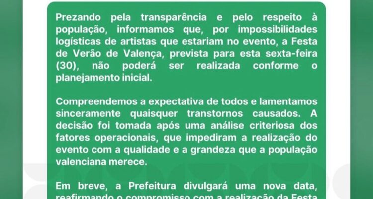 A PREFS TENTOU ATÉ O ÚLTIMO MINUTO, MAS… Ricardo Lemos 28 de janeiro de 2026 Cultura, Notícias Prezando pela transparência e pelo respeito à população, informamos que, por impossibilidades logísticas de artistas que estariam no evento, a Festa de Verão de Valença, prevista para esta sexta-feira (30), não poderá ser realizada conforme planejamento inicial. Compreendemos a expectativa de todos e lamentamos sinceramente quaisquer transtornos causados. A decisão foi tomada após uma análise criteriosa dos fatores operacionais, que impediram a realização do evento com a qualidade e a grandeza que a população valenciana merece. Logo logo, a Prefeitura divulgará uma nova data, reafirmando o compromisso com a realização da Festa de Verão e com a valorização da economia, da cultura, do turismo e do entretenimento no município. Mais uma vez, agradecemos a compreensão de todos. Secretaria de Comunicação |SECOM Prefeitura Municipal de Valença Deixe uma resposta Cancelar resposta Seu endereço de email não será publicado.ComentarNome* Email* Website