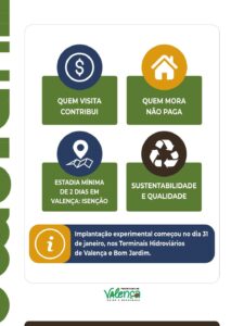 Para fomentar o comércio e a rede hoteleira, a Prefeitura criou um incentivo inteligente, o turista que comprovar uma estadia mínima de 2 dias na cidade também fica isento da tarifa. A estratégia visa combater o turismo de passagem rápida e fazer com que o visitante consuma nos restaurantes, pousadas e lojas de Valença.