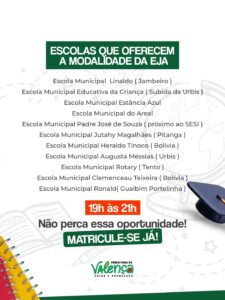 A Prefeitura de Valença, através da Secretaria de Educação, informa que foram prorrogadas até o dia 2 de março as inscrições para a Educação de Jovens e Adultos (EJA). A medida amplia a oportunidade para pessoas que não concluíram os estudos na idade regular e desejam retomar a vida escolar.
