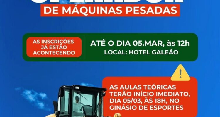 PREFEITURA DE VALENÇA ABRE INSCRIÇÕES PARA O CURSO DE OPERADOR DE MÁQUINAS PESADAS Ricardo Lemos 4 de março de 2026 Notícias, Política O curso é oferecido pela GCS – Cursos Profissionalizantes, em parceria com as Secretarias Municipais de Agricultura, de Estradas e Rodagens, e Juventude e Esportes. As inscrições estão sendo realizadas no Hotel Galeão, localizado na rua Barão de Jiquiriçá, nº 191, Centro, e seguem até a próxima quinta-feira (05), às 12h. As aulas teóricas terão início imediato, no mesmo dia, às 18h, no Ginásio de Esportes de Valença. O curso tem como principal objetivo ampliar as chances de inserção no mercado de trabalho, especialmente em um segmento que apresenta alta demanda por mão de obra qualificada. A formação oferece conhecimentos técnicos fundamentais para a operação segura e eficiente de máquinas pesadas, contribuindo diretamente para o desenvolvimento dos setores agrícola, de infraestrutura e de obras públicas no município. O secretário de Agricultura, Clóvis Coutinho, destacou a importância da iniciativa e relembrou o sucesso da edição anterior. “No ano passado tivemos mais de 500 inscritos, o que demonstra o interesse da nossa população por qualificação profissional. Esse curso abre portas, gera renda e fortalece o mercado de trabalho em Valença. Convidamos todos que desejam se capacitar a não perderem essa oportunidade”, afirmou. Secretaria de Comunicação | SECOM Prefeitura Municipal de Valença Deixe uma resposta Cancelar resposta Seu endereço de email não será publicado.ComentarNome* Email* Website