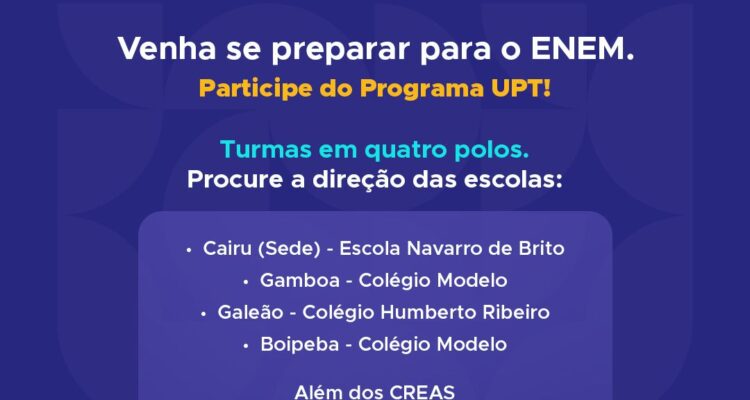 As inscrições para o Programa Universidade para Todos (UPT) seguem abertas até a próxima quinta-feira, dia 19. No município-arquipélago de Cairu, o programa contará com turmas nas localidades da Sede, Gamboa, Galeão e Boipeba, ampliando o acesso de estudantes e egressos da rede pública à preparação para o ingresso no ensino superior.