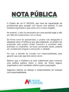 O Projeto de Lei n° 09/2026, que trata da capacitação de profissionais para atuação com alunos com autismo, é uma iniciativa importante e que conta com o nosso respeito.