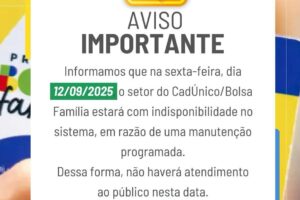 ATENÇÃO: SETOR DO CADÚNICO/BOLSA FAMÍLIA NÃO TERÁ ATENDIMENTO NESTA SEXTA-FEIRA (12) EM VALENÇA Ricardo Lemos 9 de setembro de 2025 Notícias, Política A Prefeitura de Valença, por meio da Secretaria de Promoção Social, informa que na próxima sexta-feira, 12 de setembro de 2025, o setor do CadÚnico/Bolsa Família estará com o sistema indisponível...