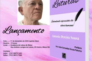 ACADEMIA DE LETRAS DE ILHÉUS SEDIARÁ O LANÇAMENTO DO 8º LIVRO DE ANTONIO PEREIRA SOUSA Ricardo Lemos 11 de dezembro de 2025 Cultura, Notícias Tradicionalmente, os escritores, poetas e historiadores da Região Cacaueira utilizam o Salão Nobre da Academia de Letras de Ilhéus (ALI) para reunir família, amigos, colegas e admiradores em torno da...