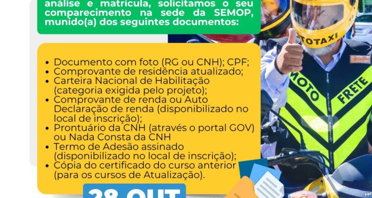 Os participantes deverão levar documentos pessoais e comprobatórios, incluindo RG ou CNH, CPF, comprovante de residência atualizado, comprovante de renda (ou autodeclaração, disponível no local), prontuário ou nada consta da CNH, e, para os cursos de atualização, cópia do certificado anterior.
