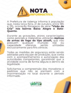 PREFEITURA DE VALENÇA EMITE NOTA SOBRE FILMAGENS DA SÉRIE “VISÃO DE CRIA” NOS BAIRROS BAIXA ALEGRE E BATE-QUENTE Ricardo Lemos 21 de outubro de 2025 Cultura, Notícias A Prefeitura de Valença informa à população que, nesta terça-feira, 21 de outubro, entre 18h e 21h, serão realizadas filmagens da série “Visão de Cria” nos bairros Baixa Alegre e Bate-Quente. Durante as gravações, atores caracterizados como policiais e personagens do enredo utilizarão réplicas de armas de fogo do tipo airsoft, que não possuem qualquer tipo de munição real nem capacidade ofensiva, sendo usadas exclusivamente para fins cênicos. A produção segue todas as normas de segurança, com acompanhamento e autorização das autoridades competentes, garantindo que a atividade ocorra de forma segura e dentro da legalidade. A Prefeitura solicita a compreensão dos moradores e pede que a população não se assuste com a movimentação nas localidades durante o período das filmagens. “Nosso objetivo é assegurar transparência e tranquilizar os cidadãos, reforçando que todo o processo está sendo conduzido de maneira responsável”, destaca a gestão municipal. Deixe uma resposta Cancelar resposta Seu endereço de email não será publicado.ComentarNome* Email* Website