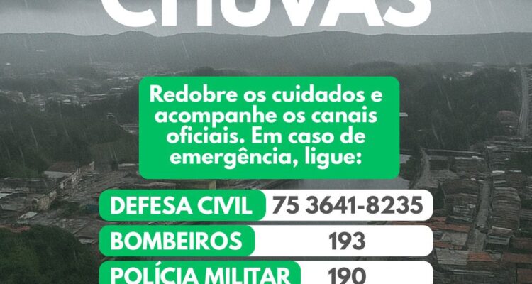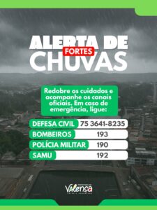 DEFESA CIVIL DE VALENÇA ALERTA PARA CONTINUIDADE DAS CHUVAS NO MUNICÍPIO Ricardo Lemos 12 de novembro de 2025 Notícias, Política A Secretaria Municipal de Ordem Pública (SEMOP), por meio da Defesa Civil de Valença, emitiu na manhã desta quarta-feira (12) um boletim meteorológico e de alerta em razão do volume elevado de chuvas registrado nas últimas 36 horas na cidade. De acordo com dados do CEMADEN (Centro Nacional de Monitoramento e Alertas de Desastres Naturais), o ponto de observação localizado no Alto de São Roque registrou: No dia 11/11, um acumulado de 24,5 mm de precipitação; já nesta quarta-feira (12/11), até o momento da medição (11h), o volume chegou a 22,6 mm, praticamente igualando o total do dia anterior. O órgão destaca que o cenário aponta continuidade das chuvas com intensidade moderada a forte, o que eleva o risco de alagamentos pontuais, aumento no nível de córregos e possíveis deslizamentos de terra em áreas de encosta. Diante da situação, a Defesa Civil mantém o município em estado de atenção e recomenda que a população redobre os cuidados em áreas de risco, evite transitar por vias alagadas e não permaneça próximo a barrancos ou encostas. Contatos para emergência Defesa Civil: (75) 3641-8235 Ouvidoria Municipal: 0800 071 4346 Corpo de Bombeiros: 193 SAMU: 192 Guarda Municipal: (75) 3689-1620 Deixe uma resposta Cancelar resposta Seu endereço de email não será publicado.ComentarNome* Email* Website