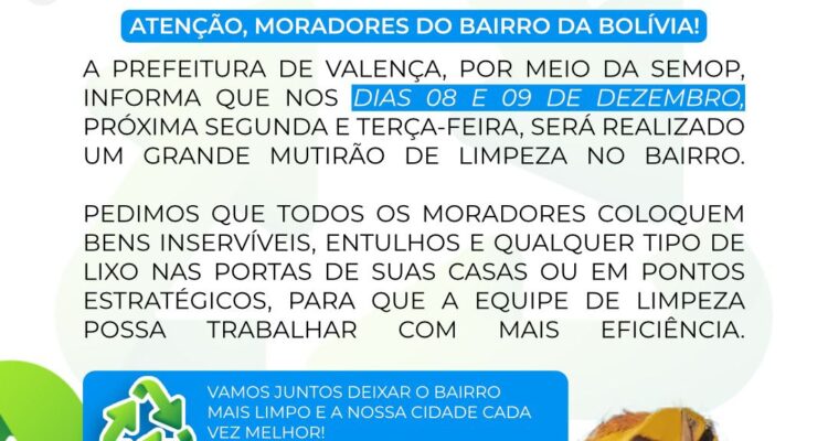A Prefeitura de Valença, por meio da Secretaria Municipal de Obras e Infraestrutura (SEMOP), realizará um grande mutirão de limpeza no bairro da Bolívia nos dias 08 e 09 de dezembro, próxima segunda e terça-feira.