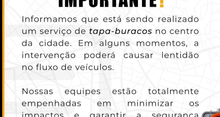 PREFEITURA DE VALENÇA REALIZA OPERAÇÃO TAPA-BURACOS NO CENTRO DA CIDADE Ricardo Lemos 16 de dezembro de 2025 Notícias, Política A Prefeitura de Valença, por meio da Superintendência Municipal de Trânsito (DMTRAN), informa que está sendo realizada uma operação de tapa-buracos no centro da cidade, com o objetivo de melhorar as condições de tráfego, garantir mais segurança para motoristas e pedestres e preservar a infraestrutura viária. Durante a execução dos serviços, poderá haver lentidão momentânea no fluxo de veículos em alguns trechos, em função das intervenções necessárias para a realização dos reparos. As equipes estão totalmente empenhadas em minimizar os impactos no trânsito, adotando medidas para manter a fluidez e garantir a segurança viária, além de trabalhar para que os serviços sejam concluídos no menor tempo possível. A Prefeitura de Valença agradece a compreensão da população e reforça que as ações fazem parte do compromisso com a melhoria da mobilidade urbana e da qualidade de vida dos valencianos. Deixe uma resposta Cancelar resposta Seu endereço de email não será publicado.ComentarNome* Email* Website