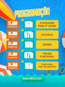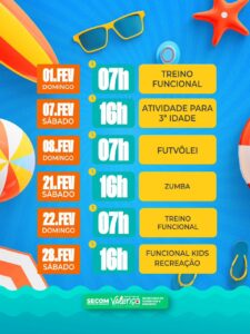 A programação conta com aulas de treino funcional, zumba, futvôlei, atividades voltadas à terceira idade e funcional kids com recreação, sempre realizadas aos sábados e domingos, em horários estratégicos para aproveitar o clima do verão.