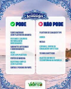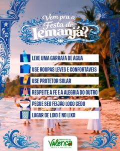 PRAIA DE GUAIBIM RECEBE CELEBRAÇÃO DO DIA DE IEMANJÁ COM FÉ, CULTURA E TRADIÇÃO Ricardo Lemos 26 de janeiro de 2026 Cultura, Notícias A Praia de Guaibim, em Valença, celebrará um dos mais tradicionais eventos do calendário cultural do município: o Dia de Iemanjá. A homenagem à Rainha do Mar acontece segunda-feira (02), a partir das 08h, reunindo fé, devoção, manifestações culturais e alegria popular. Promovido pela Prefeitura de Valença, através da Secretaria de Cultura, o evento convida moradores e visitantes a participarem de um momento marcado pelo respeito às tradições religiosas e à diversidade cultural. A programação tem início às 08h, com concentração em frente à ASPANG. Às 09h, ocorre a saída do cortejo com a entrega do presente a Iemanjá, um dos momentos mais simbólicos da celebração. Encerrando a manhã festiva, às 11h, o público poderá prestigiar o show da Banda Samba SD. A prefeitura orienta os participantes a levarem garrafa de água, utilizarem roupas leves e confortáveis, protetor solar e manterem atitudes de respeito à fé, à alegria do outro e ao meio ambiente. Também é reforçada a importância de descartar o lixo corretamente. Para as oferendas, é permitido levar apenas itens biodegradáveis, como flores naturais (sem plástico ou arames), perfumes e colônias em embalagens biodegradáveis, sabonetes artesanais, velas sem copo plástico, pentes de madeira, bijuterias simples sem plástico, além de cartas e pedidos em papel. A celebração do Dia de Iemanjá em Guaibim destaca a força da cultura popular, da religiosidade e do cuidado com o meio ambiente, fortalecendo a identidade cultural do município e promovendo um encontro de fé e tradição à beira-mar. Vamos juntos celebrar Iemanjá!! Secretaria de Comunicação| SECOM Prefeitura Municipal de Valença Deixe uma resposta Cancelar resposta Seu endereço de email não será publicado.ComentarNome* Email* Website