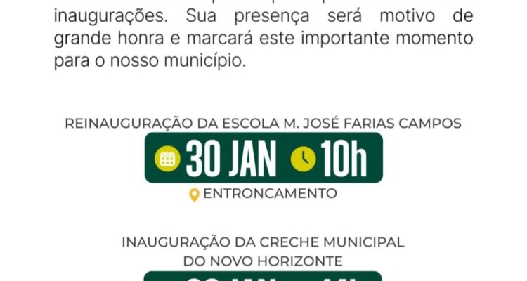 PREFEITURA DE VALENÇA MANTÉM INAUGURAÇÕES NA ÁREA DA EDUCAÇÃO NESTA SEXTA-FEIRA (30) Ricardo Lemos 29 de janeiro de 2026 Notícias, Política A Prefeitura Municipal de Valença informa que estão mantidas para esta sexta-feira, 30 de janeiro, duas importantes agendas institucionais voltadas ao fortalecimento da educação no município. Pela manhã, às 10h, será realizada a reinauguração da Escola Municipal José Farias Campos, localizada no distrito do Entroncamento. A unidade passou por melhorias que garantem mais conforto, segurança e melhores condições de ensino para alunos e profissionais da educação. Já no período da tarde, às 14h, acontece a inauguração da Creche Municipal do Novo Horizonte, situada em frente ao Tiro de Guerra. O novo equipamento amplia a oferta de vagas na educação infantil e reforça o compromisso da gestão com o cuidado e o desenvolvimento das crianças valencianas. De acordo com a administração municipal, os investimentos fazem parte de um conjunto de ações que visam fortalecer a educação pública e promover mais qualidade de vida para a população. A Prefeitura de Valença convida a comunidade a participar desses momentos importantes para o município. SECOM/VALENÇA Deixe uma resposta Cancelar resposta Seu endereço de email não será publicado.ComentarNome* Email* Website