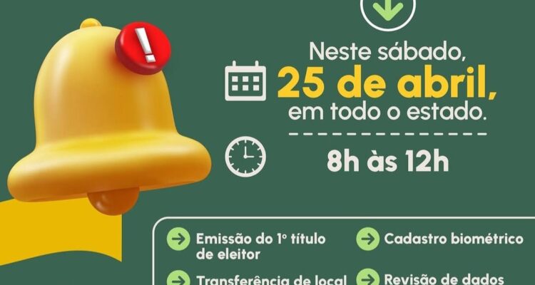 TRE PROMOVE PLANTÃO ELEITORAL NESTE SÁBADO Ricardo Lemos 23 de abril de 2026 Notícias, Política Vem aí o primeiro plantão de atendimento eleitoral do TRE-BA! Neste sábado (25/4), das 8h às 12h, você pode comparecer ao cartório eleitoral mais perto de você e ficar em dia com a Justiça Eleitoral. O plantão acontece em todo o estado, com atendimento por ordem de chegada. Participe! Lembre-se que o prazo final para realizar qualquer procedimento na Justiça Eleitoral vai até 6 de maio Serviços oferecidos: ✅ Emissão da 1ª via do título ✅ Coleta biométrica ✅ Atualização de dados cadastrais ✅ Transferência de domicílio eleitoral ✅ Regularização da situação eleitoralTRE Deixe uma resposta Cancelar resposta Seu endereço de email não será publicado.ComentarNome* Email* Website
