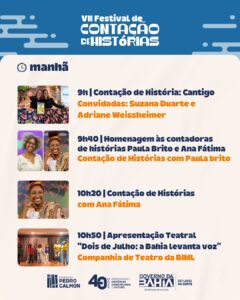 VII FESTIVAL DE CONTAÇÃO DE HISTÓRIAS CELEBRA OS 76 ANOS DA BIBLIOTECA MONTEIRO LOBATO COM PROGRAMAÇÃO PARA CRIANÇAS E FAMÍLIAS Ricardo Lemos 23 de abril de 2026 Cultura, Notícias A Biblioteca Infantil Monteiro Lobato (BIML), um dos mais importantes espaços de formação leitora da Bahia, comemora seus 76 anos com uma programação especial dentro do VII Festival de Contação de Histórias, que acontece no próximo dia 24 de abril, a partir das 9h, em Salvador. Promovido pela Fundação Pedro Calmon (FPC/Secult-BA), através da Diretoria de Bibliotecas Públicas (DIBIP), o evento reúne escritores, contadores de histórias, artistas e educadores em uma jornada dedicada à imaginação, à oralidade e ao incentivo à leitura, especialmente entre o público infantil. A programação contempla atividades ao longo de todo o dia, incluindo contações de histórias, homenagens, encontros com autores e apresentações culturais. Entre os destaques da manhã estão as participações de Suzana Duarte e Adriane Weissheimer, além da homenagem às contadoras Paula Brito e Ana Fátima. O público também poderá assistir à apresentação teatral “Dois de Julho: a Bahia levanta a voz”, da Companhia de Teatro da BIML. No período da tarde, a escritora mirim Analiz Rodrigues participa de um encontro com o público, seguida de uma rodada de contação de histórias com Sandra Barbosa e Argemira Silva. Encerrando a programação, o grupo Pé de Lata realiza uma apresentação musical voltada para o público infantil. Além de celebrar a arte de contar histórias, o festival marca o aniversário da Biblioteca Monteiro Lobato, reafirmando seu papel histórico na formação de leitores e no acesso democrático à cultura. Serviço VII Festival de Contação de Histórias Data: 24 de abril Horário: A partir das 9h Local: Biblioteca Infantil Monteiro Lobato – Salvador Entrada gratuita! Ascom FPC Deixe uma resposta Cancelar resposta Seu endereço de email não será publicado.ComentarNome* Email* Website
