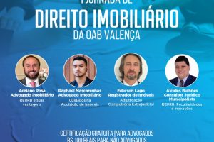 OAB VALENÇA PROMOVE 1ª JORNADA DE DIREITO IMOBILIÁRIO Ricardo Lemos 6 de outubro de 2022 Notícias Jornada de Direito Imobiliário será realizado em Valença. A OAB Subseção Valença promoverá no dia 22/10 a 1ª Jornada de Direito Imobiliário. O evento contará com a palestra dos advogados Alcides...